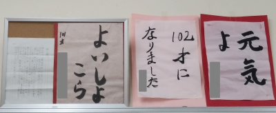 私はこのご利用者様の元気を分けていただきたく、習字の作品をいただいて事務所に貼って励みにしております。